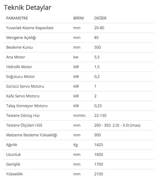 -Dikey inişle maksimum güç ve kaliteli kesim 40-280m/min arası ayarlanabilir hız. +/-0.05 ile 0,1mm arasında kesme hassasiyeti sağlayan Elektrik Servo Besleme -Maksimum 100mm boru / dolu malzeme kesebilme -Minimum 20mm boru / dolu malzeme kesebilme -Maksimum makina performansı ve uzun çalışma imkanı için mükemmel redüktör dizaynı -Beslemede yüksek hassasiyet sağlayan, taşmaya imkan veren kıskaç dizaynlı besleme sistemi Kesme Örneklemeleri : -100mm çap dolu malzeme, kesme süresi 11saniye -Açıklayıcı ve kullanıcı dostu dokunmatik ekran -Tek boy üzerinde farklı ölçülerde kesim yapabilmeye olanak sağlayan çoklu programlama -Operatörün güvenliği ve kullanım kolaylığı sağlayan çalışma kabini -Helical dişli ile yüksek operasyon hızında çalışmada her türlü titreşimi, oynamayı engelleyen güçlendirilmiş kafa sistemi.